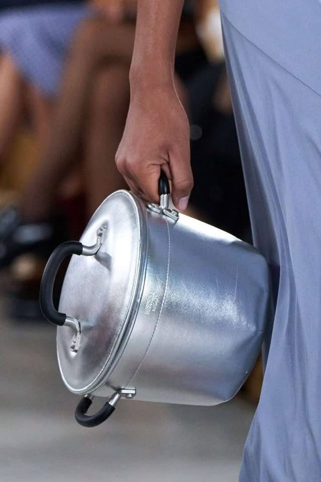 Perhaps the boldest of all is the saucepan bag — a literal pot transformed into an accessory. With its metallic shine and practical handle, it epitomizes Moschino’s flair for turning everyday objects into high-fashion statements. It won’t be for everyone, but for collectors and daring dressers, this piece is likely to become one of the most memorable items from the collection.